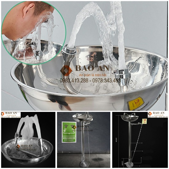 - Bồn rửa mắt được thiết kế để ngay lập tức phun nước sạch tác động vào mắt loại chất gây ô nhiễm ra khỏi đôi mắt sau khi tiếp xúc. Thiết bị nên được đặt gần các khu vực có nguy cơ cao và luôn trong điều kiện sẵn sàng.