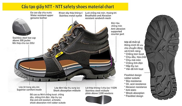 + Chống va đập, đâm xuyên với mũi và lót giày làm từ thép không gỉ